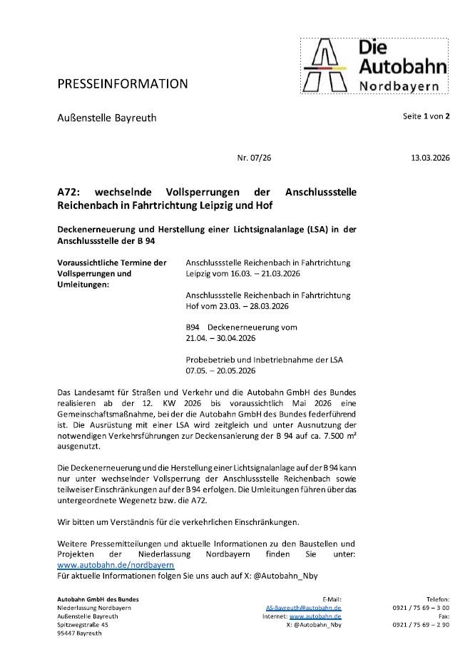 Sperrung Anschlussstelle Reichenbach A72